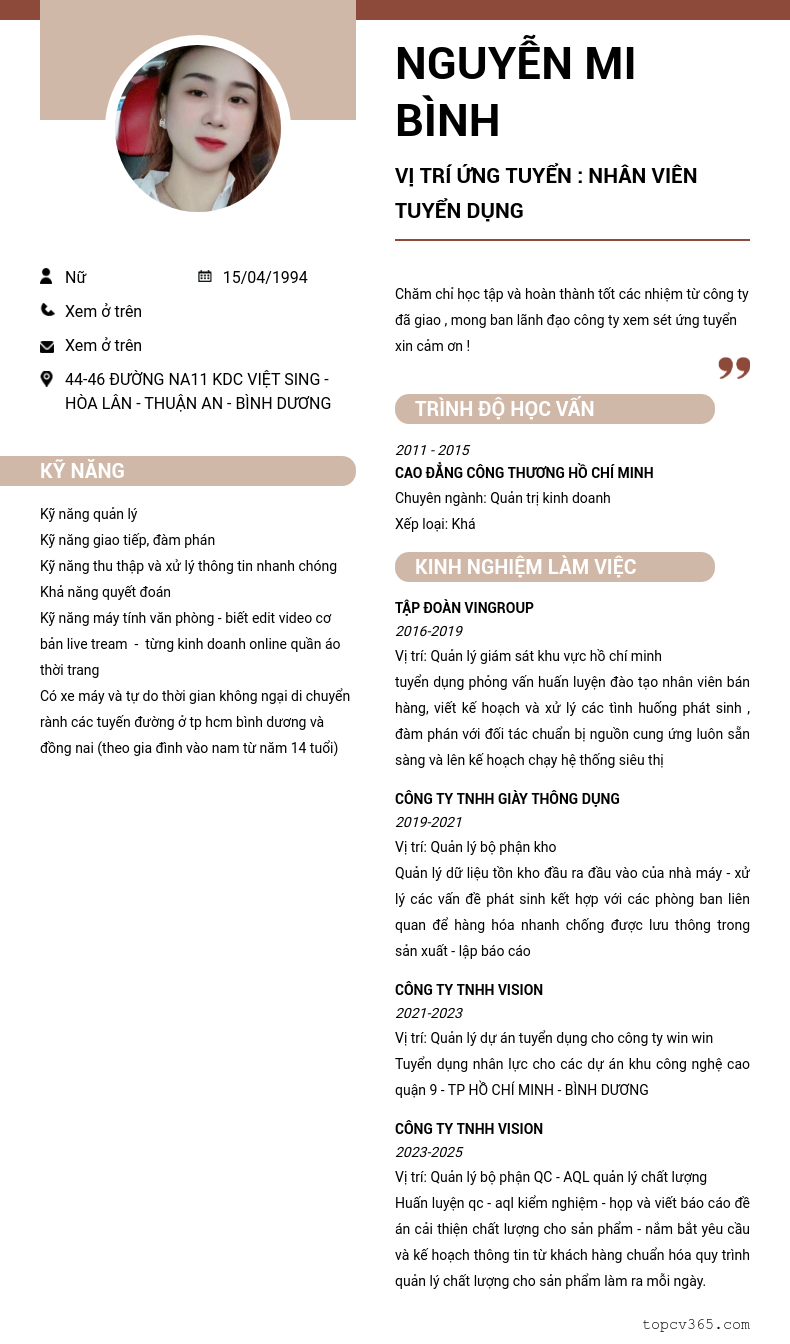 VỊ TRÍ ỨNG TUYỂN : nhân viên tuyển dụng
